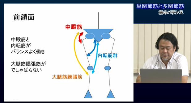 以下のスライドでは股関節の単関節筋と多関節筋の関係について説明されていますが、この大殿筋+ハムストリングス、 腸腰筋+大腿四頭筋という関係はご存知の方も多いと思います。この説明のあとに大腿四頭筋が優位になることが 多くみられるお話も添えられており、私も「やはり、そうか」と頷きながらDVDを見させて頂きました。