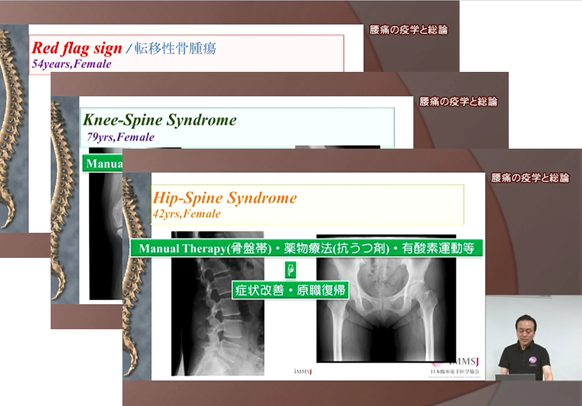 Red flag sign, Green light, Yellow flag signについて総論を説明した後に、ご自身の臨床経験をcase studyとして説明しています。理学療法評価以外にも、確認しておくべき評価項目についても触れながら、評価、治療の選択、その後の患者さんの経過まで画像も合わせて説明があり、大変参考になりました。